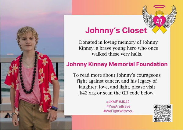 The JKMF is continuously stocking Johnny’s Closet, a one-of-a-kind wardrobe located in the Goryeb Children’s Hospital (GCH) / Valerie Fund Center in Morristown, NJ, where our beloved Johnny bravely underwent treatment.